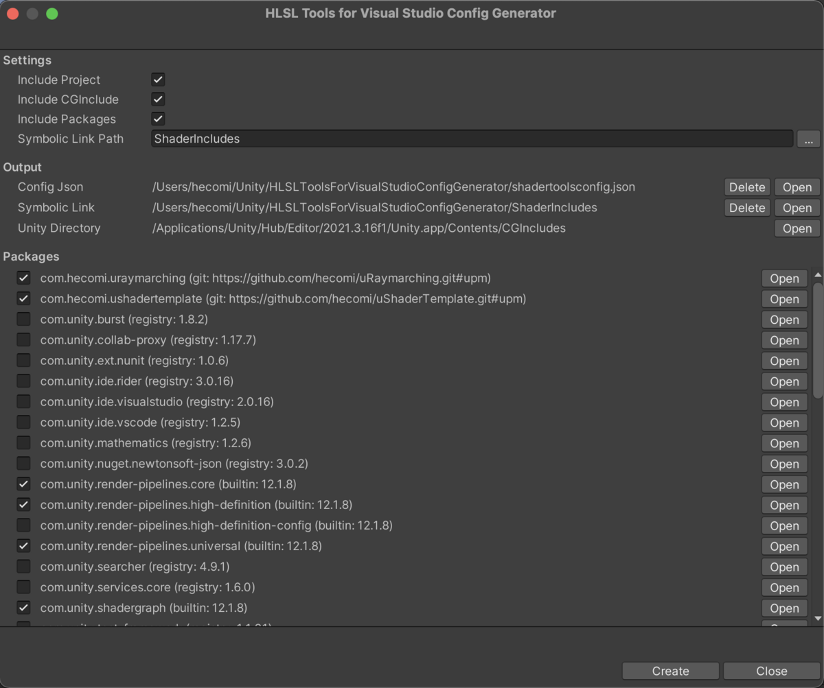 これらを Unity のプロジェクトで使用する際は lshadertoolsconfig.json という設定ファイルを作成し、Unity がシェーダ内で暗黙的にパス解決してくれている部分を補助してあげる記述をする必要があります(どのディレクトリを Include するか記述するなど)。この設定ファイルの作成及びパス解決の補助を簡単にするためのエディタ拡張として、以前 HLSLToolsForVisualStudioConfigGenerator というものを作成しました。